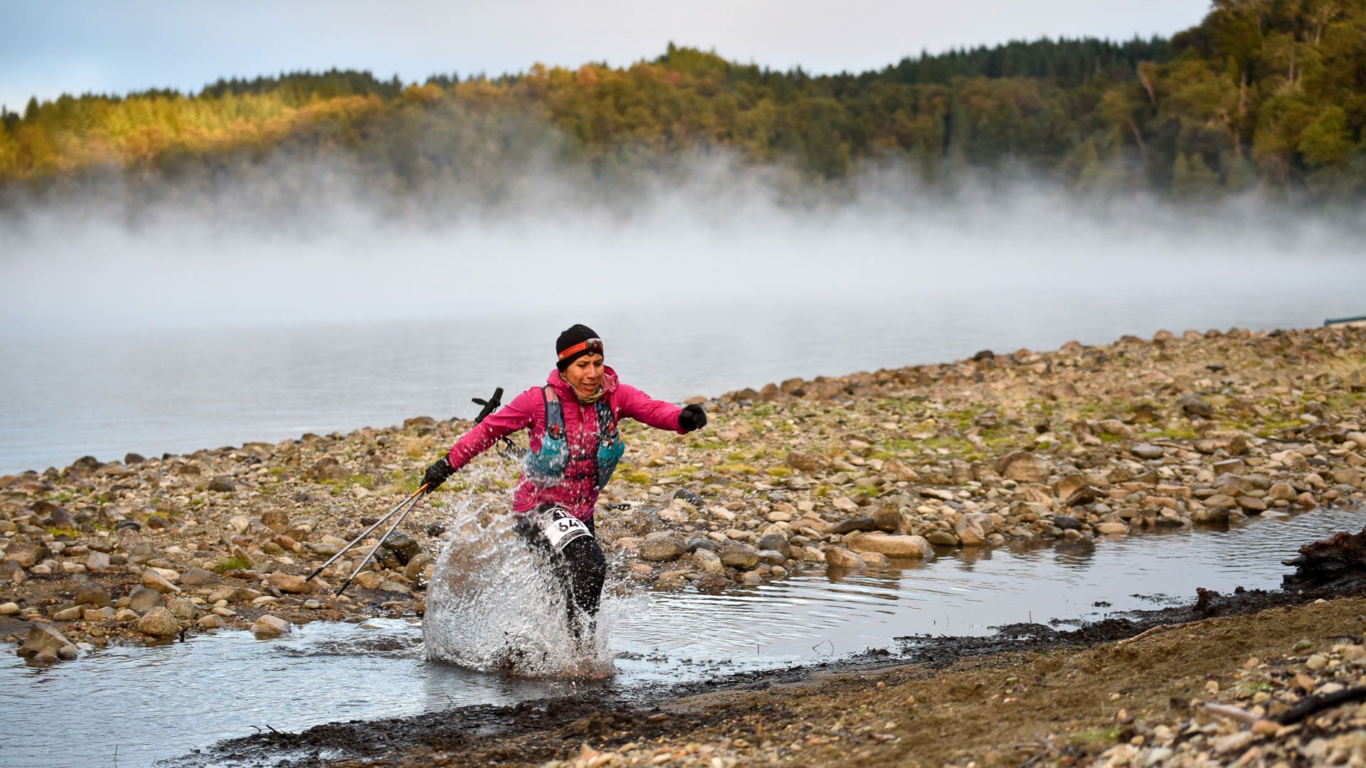 El sol se asomaba detrás de las montañas. La humedad de los campos forman una nueve inmensa que pintaba los valles de blanco. Llevamos más de 68K de recorrido cuando desemboqué en uno de los laterales del lago Lácar. Por delante, 1K por adentro del lago, literalmente, con el agua hasta las canillas y, por momentos, por encima de las rodillas. Lo que puede parecer una tortura les aseguro que, a esa altura de la carrera fue más un alivio, que deshinchaba y relaja los pies.